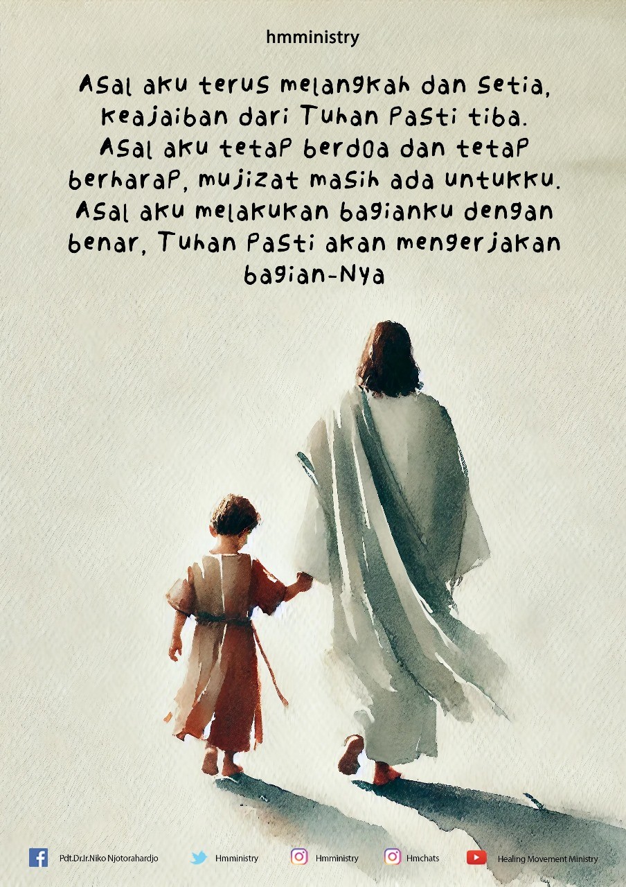 "Asal aku terus melangkah dan setia, keajaiban dari Tuhan pasti tiba. Asal aku tetap berdoa dan tetap berharap, mujizat masih ada untukku. Asal aku melakukan bagianku dengan benar, Tuhan pasti akan mengerjakan bagian-Nya."